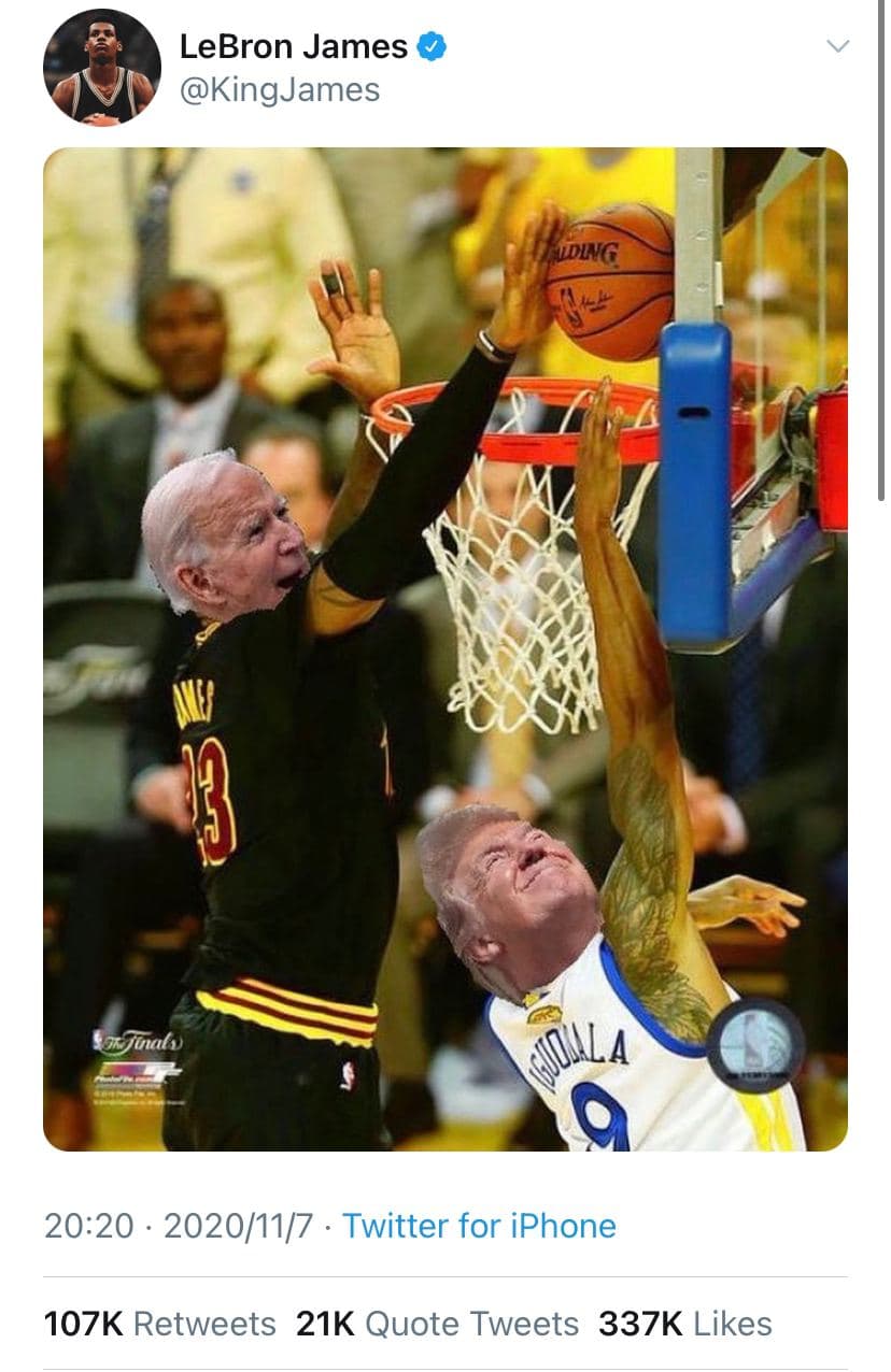 لبرون جیمز، فوق ستاره بسکتبال آمریکا نیز عکس العمل جالبی در توئیتر داشته و تصویری از پرواز جو بایدن پای سبد بسکتبال بالاتر از دونالد ترامپ منتشر کرده است.