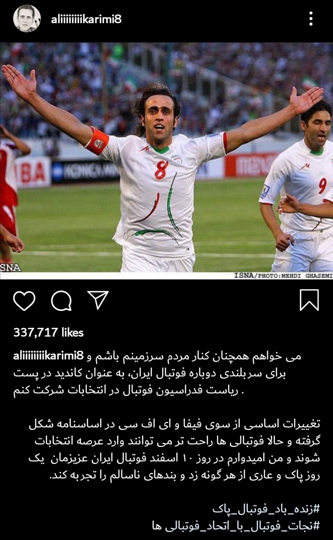 علی کریمی با انتشار پستی در صفحه شخصی خود، از تصمیمش برای کاندیداتوری پست ریاست فدراسیون فوتبال خبر داد. او در این پست آورده است: می‌خواهم همچنان کنار مردم سرزمینم باشم و برای سربلندی دوباره فوتبال ایران، به عنوان کاندیدا در پست ریاست فدراسیون فوتبال در انتخابات شرکت کنم.