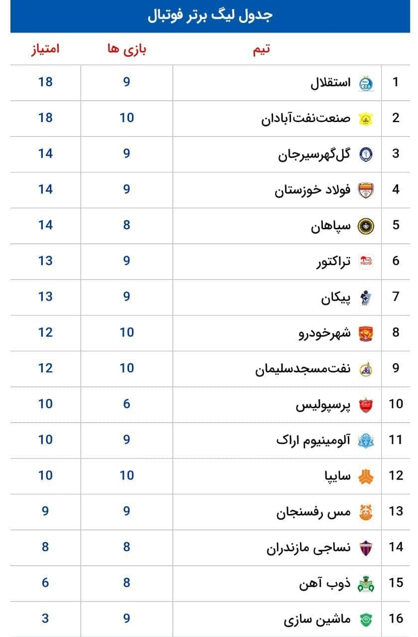 نکته عجیب این جدول، اما اختلاف پرسپولیس، قهرمان ۴ دوره اخیر لیگ برتر، با صدر جدول است؛ شاگردان گل محمدی که در مقایسه با سایر تیمهای لیگ بازیهای کمتری انجام داده اند فعلا با ۱۰ امتیاز در میانههای جدول جا خوش کرده اند و با صدر جدول که در اختیار استقلال است ۸ امتیاز فاصله دارند. در طول فصول گذشته چنین فاصلهای بین پرسپولیس و صدر جدول بعید بوده است.