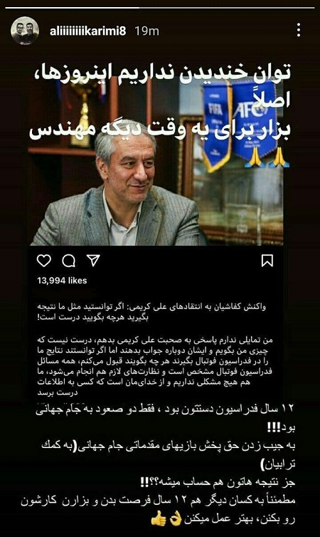 پس از انتقاد علی کریمی از علی کفاشیان، رئیس سابق فدراسیون فوتبال گفت که اگر علی کریمی نتایج ما را در فدراسیون گرفت، هرچه بگوید قبول است. علی کریمی نیز در یک استوری اینستاگرامی، جواب کفاشیان را داد.