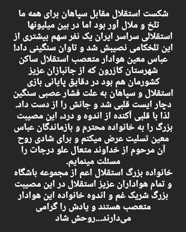 باخت روز گذشته استقلال مقابل سپاهان علاوه بر حواشی که داشته است حاوی یک خبر تلخ بود. یکی از هواداران استقلال پس از باخت روز گذشته این تیم دچار ایست قلبی شد و فوت کرد. عباس معین ساکن کازرون که از جانبازان عزیز کشورمان هم بود به دلیل فشار عصبی زیاد بعد از شکست ایست قلبی کرد و دار فانی را وداع گفت.