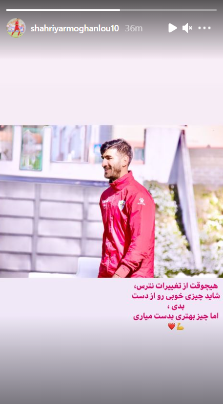 شهریار مغانلو که این روزها شایعاتی زیادی در خصوص آینده او و احتمال حضورش در پرسپولیس مطرح میشود، با انتشار یک استوری در اینستاگرامش نوشت: «هیچوقت از تغییرات نترس، شاید چیز خوبی رو از دست بدی، اما چیز بهتری بدست میاری.»