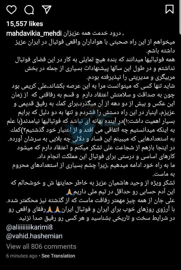 مهدی مهدویکیا در حمایت از علی کریمی، پست جالبی را در صفحه اینستاگرام خود منتشر کرد.