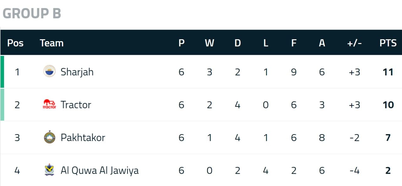 شارجه با این شکست ۱۱ امتیازی ماند و در رده نخست قرار گرفت و تراکتور با ۱۰ امتیاز دوم شد تا برای صعود، نگاهی به بازیهای دو گروه باقی مانده دیگر داشته باشد.