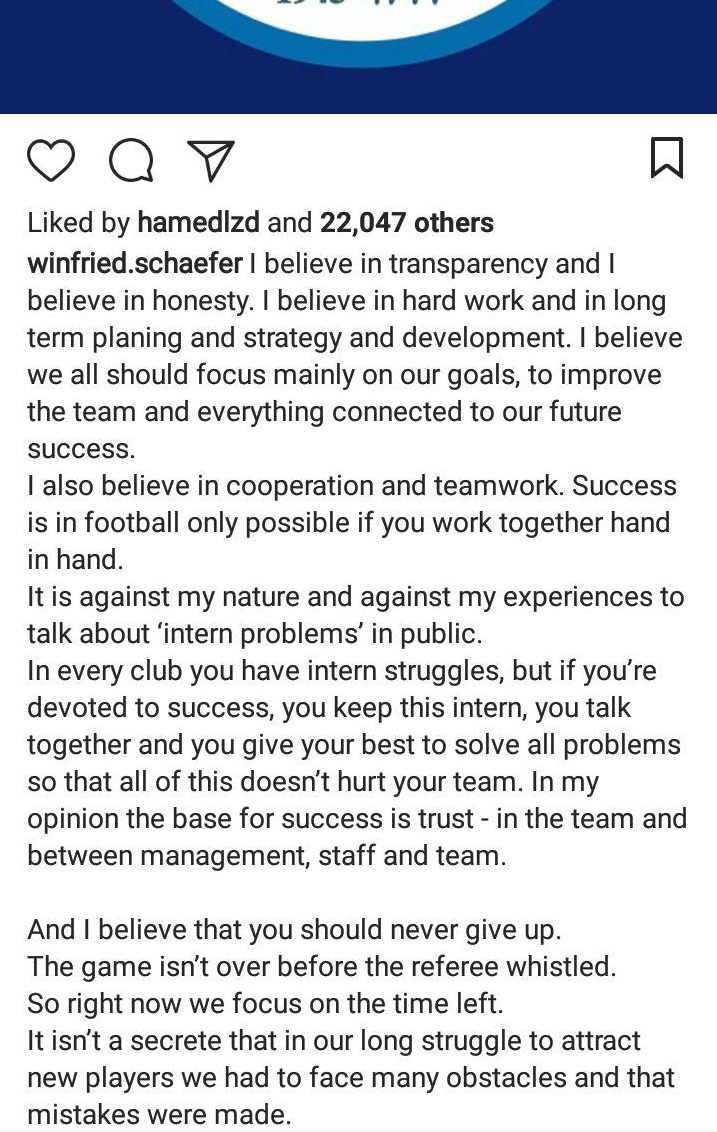 به گزارش خبر فوری ، وینفرد شفرسرمربی تیم فوتبال استقلال با انتشار پیامی در صفحه اجتماعی خود درباره مشکلات این باشگاه نوشت و گفت:در ابتدا باید بگویم به صداقت و شفافیت باور دارم. باور من به کار سخت در یک نقشه راه طولانی مدت و با استراتژی توسعه است. باور دارم همه ما باید روی اهداف بزرگ تمرکز کنیم چرا که این کار برای رشد و پیشرفت تیم و هر چیزی که به موفقیت ما در آینده مربوط است.