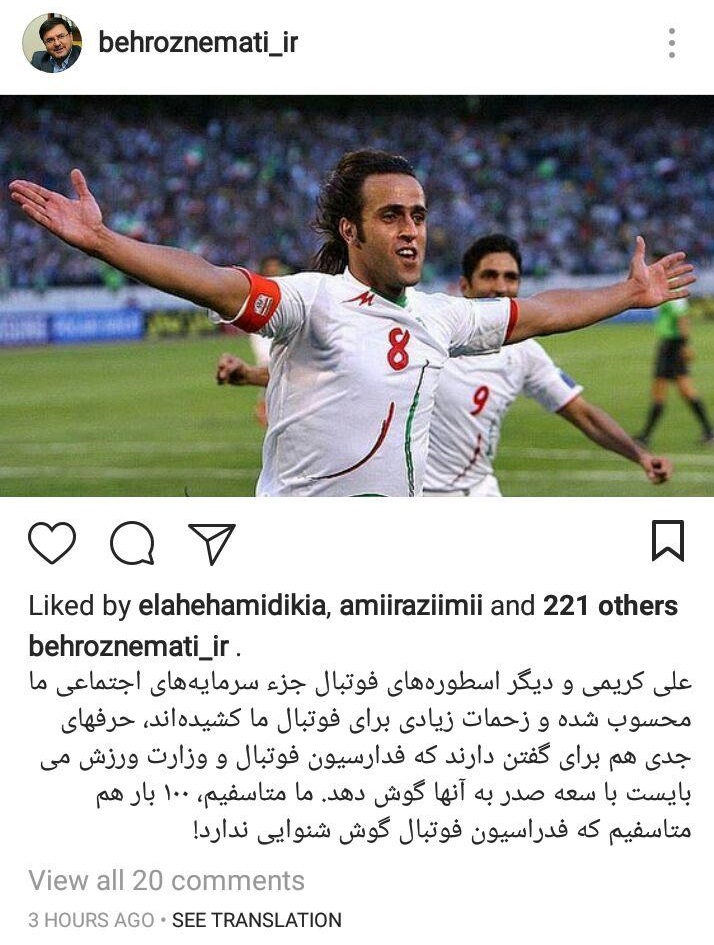 «علی کریمی و دیگر اسطورههای فوتبال جزو سرمایههای اجتماعی ما محسوب شده و زحمات زیادی برای فوتبال ما کشیدهاند. حرفهای جدی هم برای گفتن دارند که فدراسیون فوتبال و وزارت ورزش میبایست با سعه صدر به آنها گوش دهد. ما متاسفیم، صد بار هم متاسفیم که فدراسیون فوتبال گوش شنوایی ندارد.»