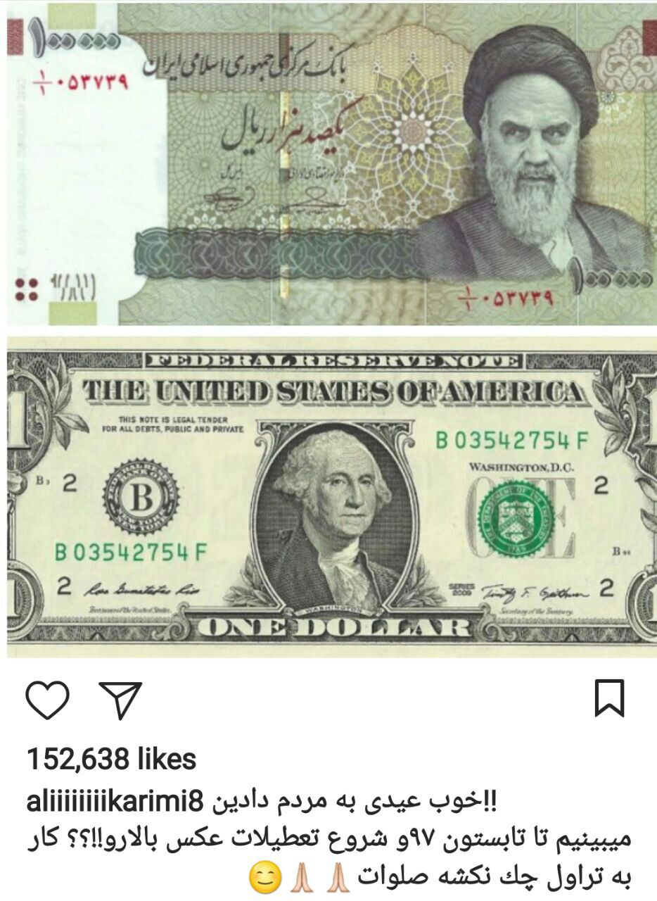 علی کریمی در واکنش به ۵هزار تومانی شدن دلار در اینستاگرامش نوشت: خوب عیدی به مردم دادید!!