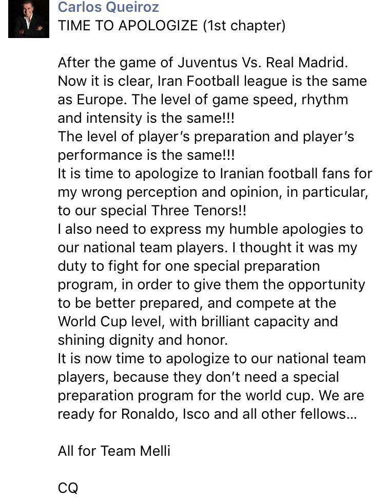 سرمربی تیم ملی با انتشار مطلبی در صفحه فیسبوک خود، از هواداران تیم ملی عذرخواهی کرد.