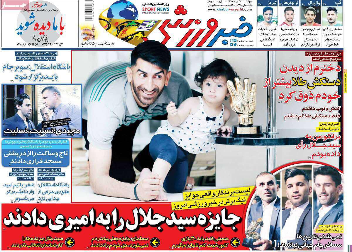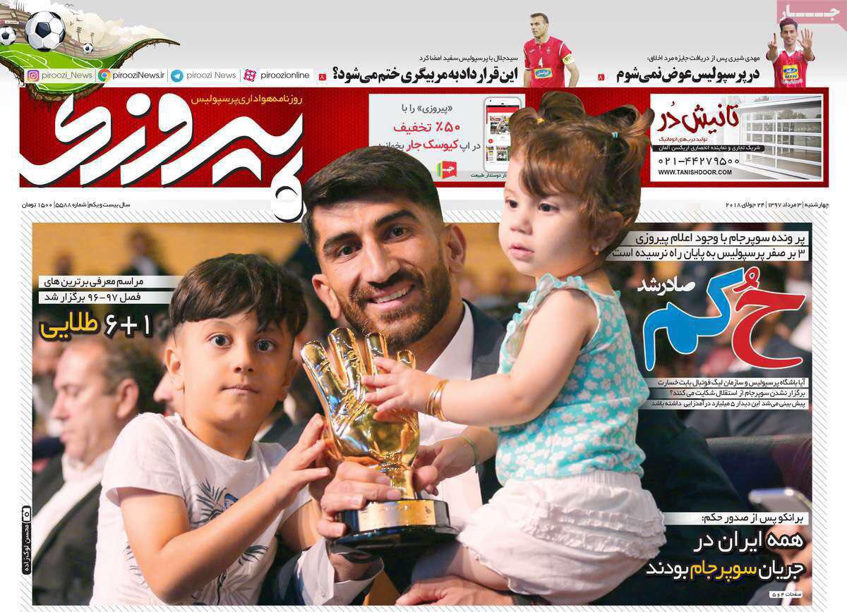 به گزارش خبرگزاری خبرآنلاین؛ پرسپولیس موفق شد قهرمان لیگ هفدهم شود و استقلال هم قهرمان جام حذفی شد تا همه منتظر یک دربی جذاب در سوپرجام باشند. قرار بود سوپرجام در تاریخ 29 تیر برگزار شود اما استقلالی ها از حضور در این دیدار خودداری کردند تا سازمان لیگ رای به 3-0 بازنده شدن آبی پوشان دهد. اما پس از این اتفاق استقلالی ها معتقد بودند سوپر جام باید در تاریخ دیگری برگزار شود و به کمیته انضباطی شکایت کردند. کمیته انضباطی فدراسیون فوتبال روز گذشته حکم دیدار سوپر جام را صادر کرد و بدین ترتیب پرسپولیس برنده اعلام و قهرمان سوپرجام شد. حال روزنامه های امروز نگاه های متفاوتی به این قضیه داشتند.