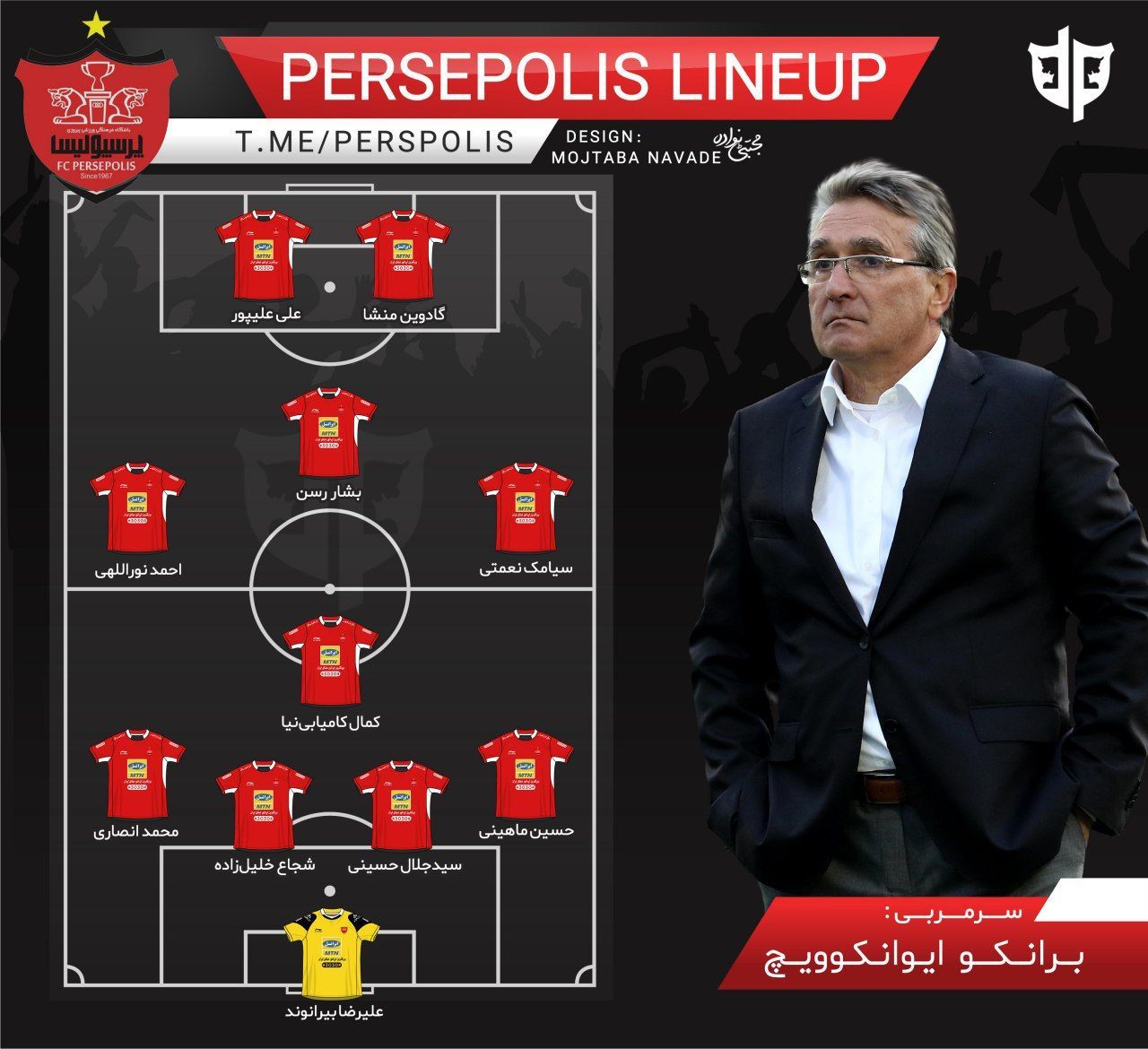 در این دیدار عليرضا بيرانوند، حسين ماهيني، سيد جلال حسيني، شجاع خليل زاده، محمد انصاري، سيامك نعمتي، كمال كاميابي نيا، احمد نوراللهي، بشار رسن، علي عليپور و گادوين منشا برای سرخپوشان به میدان می روند.