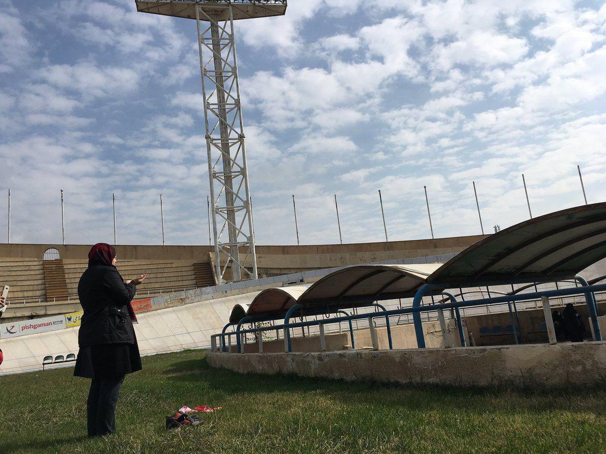 در تصویر هوادار خانم پرسپولیس در پیست دوچرخه سواری پیش از ورود به استادیوم آزادی را می بینید که در حال نماز خواندن است.
