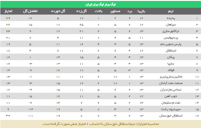 جدول لیگ برتر فوتبال در پایان هفته سیزدهم؛ بازگشت پدیده به صدر جدول و صعود استقلال به جایگاه ششم + عکس