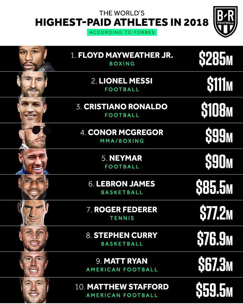 فلوید میودر بوکسور آمریکایی که پس از چندین سال در چند ماه اخیر برای مبارزه با کانر مکگرگر به رینگ بازگشته بود، 285 میلیون دلار در سال 2018 درآمد داشته است. بی دلیل نیست که او در صفحه های رسمی اش در شبکه های مجازی از زندگی مرفه خود تصاویر متعددی را منتشر می کند. البته که بوکس تنها راه درآمد میودر نیست و فعالیت های تبلیغاتی هم بخش مهمی از پول های بی پایان فلوید را ساخته اند. پس از بوکسور 42 ساله، لیونل مسی با اختلاف فاحشی ایستاده است. او 111 میلیون دلار درآمد دارد که بخش عظیمی از آن را مدیون باشگاه ابدی اش، بارسلوناست. در سال 2005 حقوق سالیانهاش به 3 میلیون یورو افزایش یافت. دو سال بعد این رقم به 7 میلیون یورو رسید و در سالهای 2008 و 2009 به ترتیب 8.5 و 10.5 میلیون یورو در سال از باشگاه دریافت می کرد. دستمزد فوق ستاره آرژانتینی در سال 2012 به 15.5 میلیون یورو رسید و این رقم در سال 2014 به 22.8 میلیون یورو افزایش پیدا کرد. مسی در سال 2017 و در آخرین تمدید قراردادش این رقم را به 40 میلیون یورو رساند. فعالیت های تبلیغاتی و درآمد ثابت از حامیان مالی او، دلیل اصلی قرارگیری او در رتبه دوم ثروتمندترین ورزشکاران جهان است. او پردرآمدترین فوتبالیست جهان هم هست.