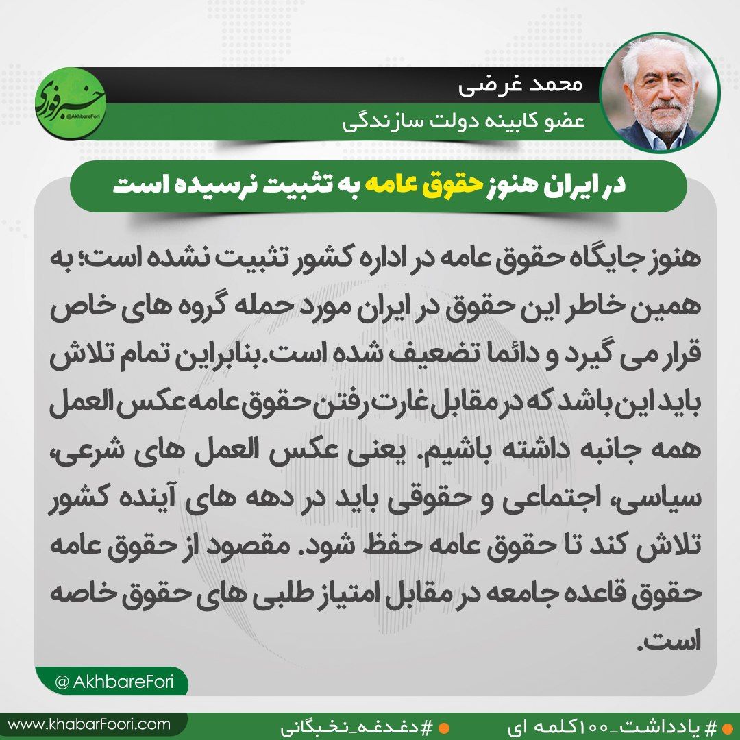 محمد غرضی عضو کابینه دولت سازندگی در دیدگاه نخبگانی خبر فوری نوشت: مقصود از حقوق عامه حقوق قاعده جامعه در مقابل امتیاز طلبی های حقوق خاصه است.
