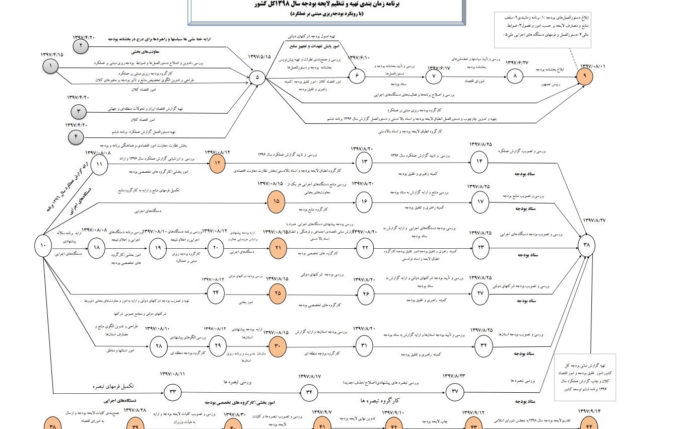همچنین تا روز 8 آبان ماه بایستی گزارش عملکرد بودجه سال 96آماده و تا تاریخ 27آبان ماه بعد از بررسی و تصویب منتشر خواهد شد. دستگاههای اجرایی تا روز 8 آبان ماه برنامه های خود را به ستد بودجه ارائه خواهند کرد و تا 25 الی 28 آبان ماه این برنامه ها در ستاد بودجه به تصویب خواهد رسید. همچنین نهایتا در روز 14 آذر ماه سال جاری لایحه بودجه سال 98 به مجلس شورای اسلامی ارائه خواهد شد.
