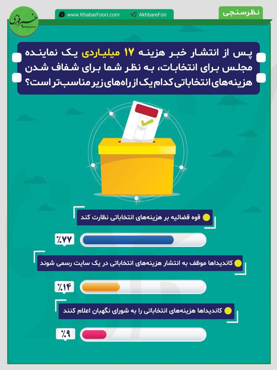 در پی انتشار خبر هزینه ۱۷ میلیاردی یک نماینده مجلس برای انتخابات، خبر فوری در یک نظرسنجی نظر مخاطبان خود را در مورد راهکار شفاف شدن هزینههای انتخاباتی پرسید.