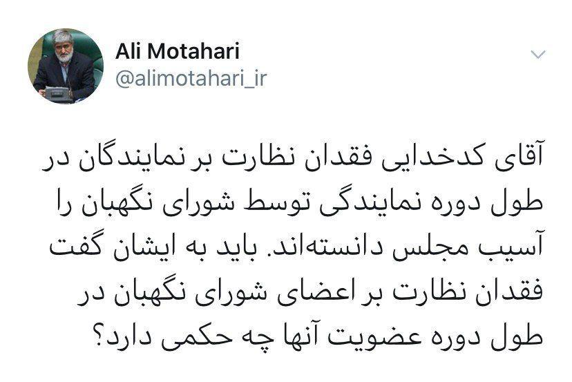 علی مطهری نماینده تهران در مجلس در توییتی خطاب به سخنگوی شورای نگهبان نوشت:آقای کدخدایی فقدان نظارت بر نمایندگان در طول دوره نمایندگی توسط شورای نگهبان را آسیب مجلس دانسته‌اند.