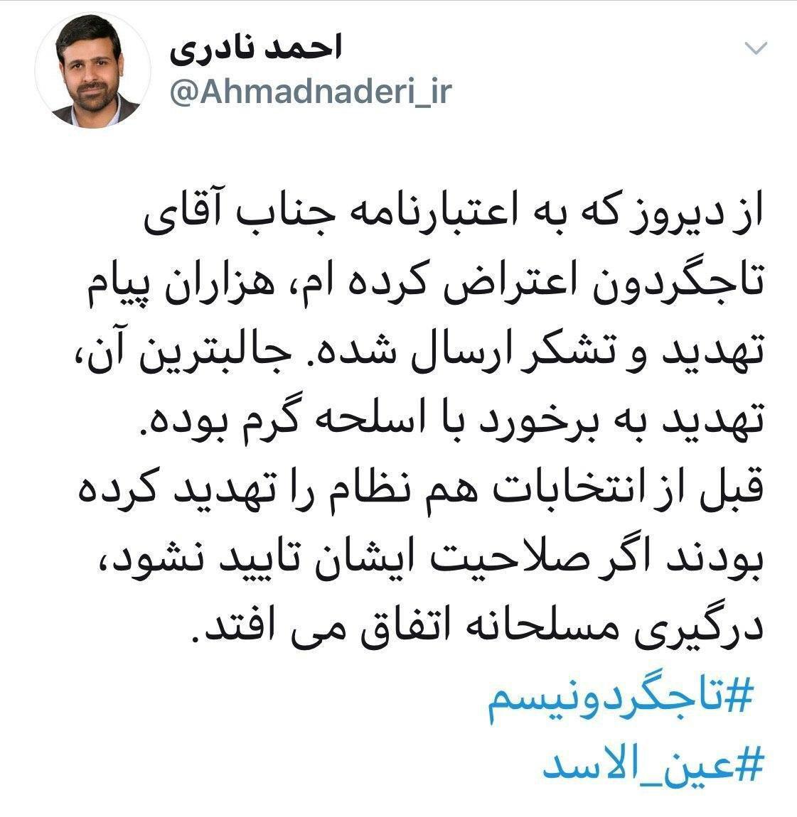 «احمد نادری» نماینده تهران در مجلس در توییتی نوشت: به علت اعتراض به اعتبارنامه «تاجگردون» تهدید مسلحانه شدهام.