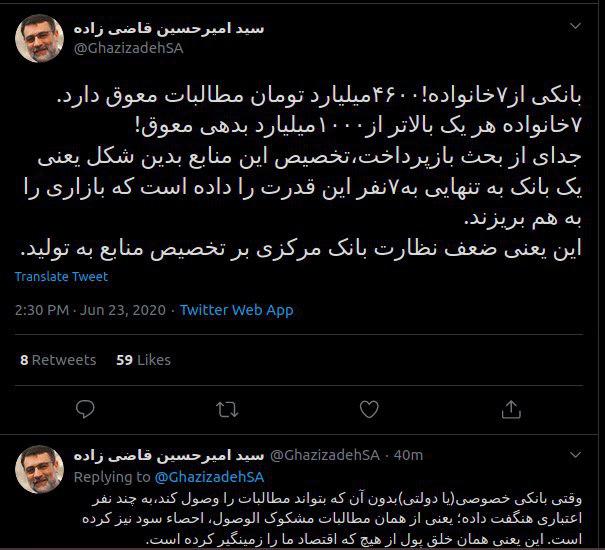 امیرحسین قاضی زاده نایب رئیس مجلس در توییتی از بدهی ۴۶۰۰ میلیاردی ۷ خانواده به یک بانک خبر داد.
