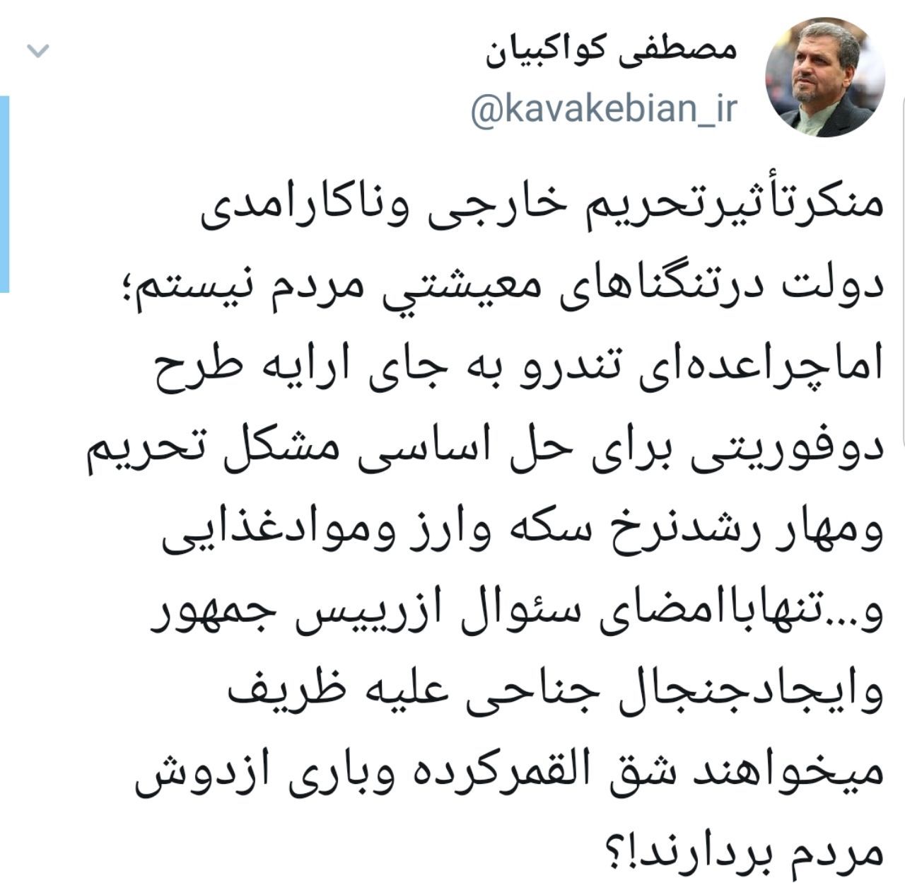 مصطفی کواکبیان، نماینده سابق تهران در مجلس شورای اسلامی، در حساب توییتری خود و در واکنش به حملات تند مجلسی ها به ظریف نوشت: «منکر تأثیر تحریم خارجی و ناکارآمدی دولت در تنگناهای معیشتی مردم نیستم؛ اما چرا عدهای تندرو به جای ارایه طرح دوفوریتی برای حل اساسی مشکل تحریم و مهار رشد نرخ سکه و ارز و مواد غذایی و... تنها با امضای سئوال از رییس جمهور و ایجاد جنجال جناحی علیه ظریف میخواهند شق القمرکرده و باری از دوش مردم بردارند!؟»
