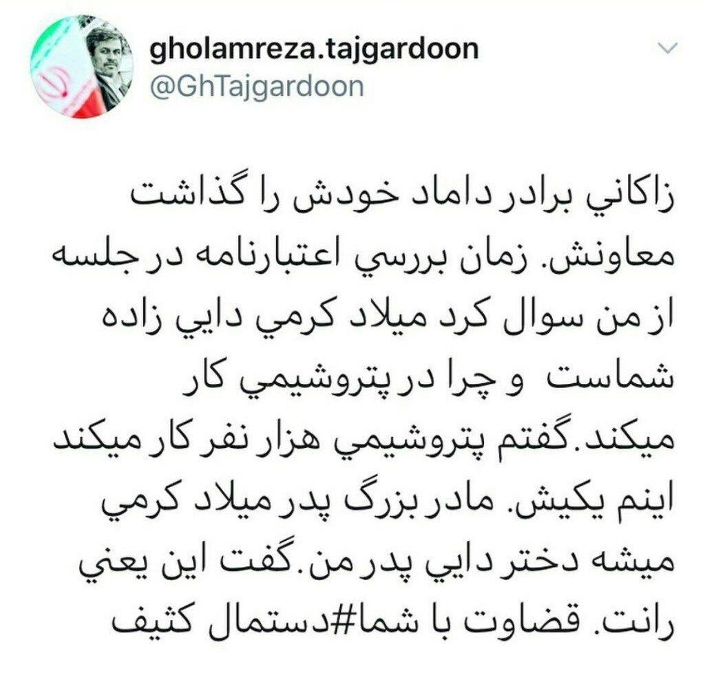 غلامرضا تاجگردون با هشتگ دستمال کثیف به انتصاب برادر داماد زاکانی به عنوان معاونش، واکنش نشان داد.