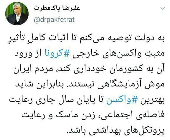 علیرضا پاکفطرت، نماینده شیراز در توصیهای به دولت عنوان کرد که واکسنهای خارجی را قبل از اثبات به ایران وارد نکنید.