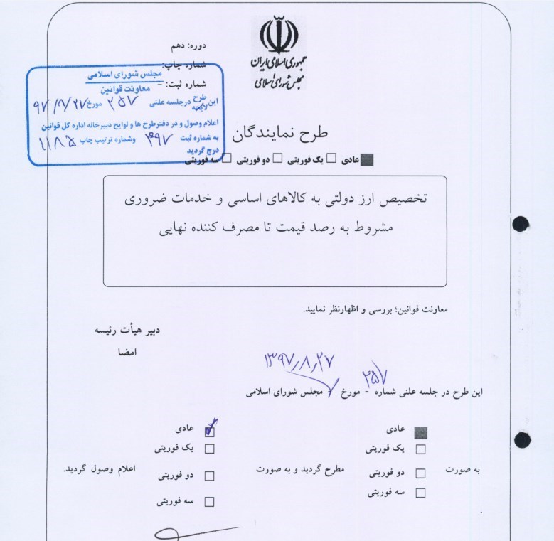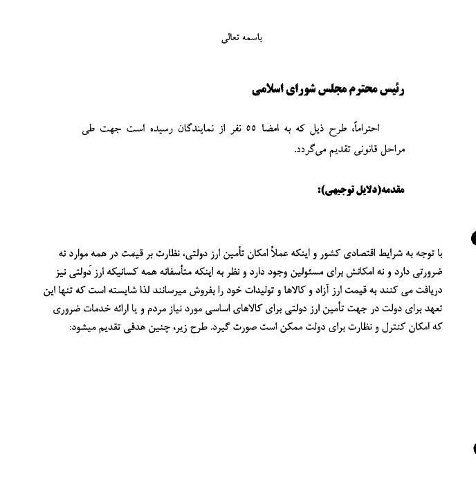 به تازگی طرح تخصیص ارز دولتی به کالاهای اساسی و خدمات ضروری در یکی از جلسات علنی پارلمان اعلام وصول شد.
