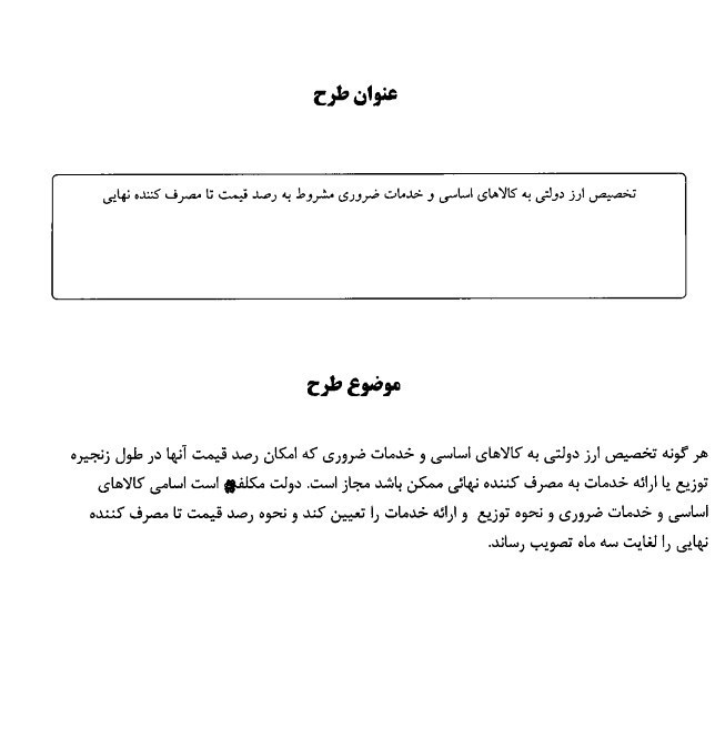 براساس این طرح در صورتی که پس از تصویب، به تأیید شورای نگهبان برسد، دولت موظف است برای تهیه کالاهای اساسی و نیز برخی خدمات ضروری ارز دولتی اختصاص دهد، هدف طراحان این طرح، حمایت از اقشار ضعیف و کم‌درآمد در دوران نوسانات نرخ ارز و تحریم‌هاست.