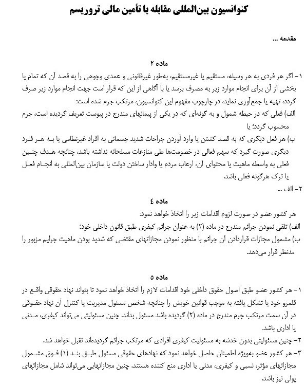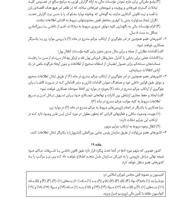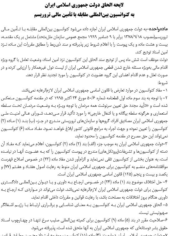 متن کامل مصوبه کمیسیون امنیتملی مجلس و ایرادات شورای نگهبان به لایحه الحاق دولت جمهوری اسلامی ایران به کنوانسیون بین المللی مقابله با تامین مالی تروریسم (CFT) به شرح زیر است: