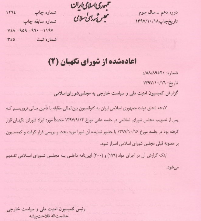 متن کامل گزارش کمیسیون امنیت ملی مجلس درباره اصرار بر مصوبه "CFT"