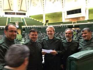 در آغاز جلسه علنی امروز نمایندگان در اقدامی نمادین در واکنش به اقدام ترامپ برای تروریستی اعلام کردن سپاه پاسداران همگی لباس سپاه بر تن کرده و پس از سروده شدن سرود ملی شعار «مرگ بر آمریکا» سردادند.