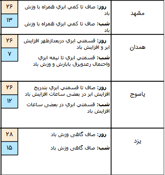 امروز در برخی نقاط استان‌های هرمزگان، جنوب کرمان و جنوب فارس و در روز یکشنبه برای جنوب و غرب فارس رگبار پراکنده، گاهی رعد و برق و وزش باد شدید روی می‌دهد. از بعدازظهر یکشنبه و طی روز دوشنبه برای پاره‌ای از مناطق شرق کشور بویژه منطقه زابل وزش باد شدید و گرد و خاک پیش بینی می‌شود.