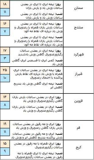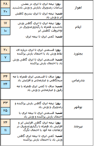 براساس آخرین نقشههای هواشناسی، امروز در جنوب غرب، غرب و دامنههای جنوبی البرز در قزوین، البرز و تهران ابرناکی گاهی رگبار و رعد و برق و وزش باد شدید و در جنوب، مرکز، شرق، شمال شرق و شمال غرب بارش پراکنده گاهی رعد و برق و وزش باد پیش بینی میشود. در استانهای قزوین و البرز همچنین در غرب خلیج فارس بارش شدت بیشتری خواهد داشت.