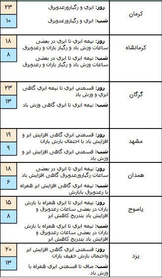 روز چهارشنبه با تداوم فعالیت سامانه در نیمه غربی کشور بارش باران ادامه داشته و در نیمه شرقی بارش پراکنده پیش بینی میشود. روز پنج شنبه گستره فعالیت این سامانه در شمال شرق و شرق بوده و برای دامنههای البرز شرقی و استانهای سمنان و سیستان و بلوچستان رگبار باران گاهی رعد و برق پیش بینی میشود و بتدریج اواخر وقت از شرق کشور خارج میشود.