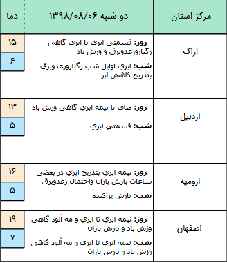 بعدازظهر سه شنبه با ورود سامانه بارشی از غرب کشور در شمال غرب، غرب و دامنههای جنوبی البرز در قزوین، البرز و تهران افزایش ابر، رگبار باران گاهی رعد و برق و وزش باد پیش بینی میشود. در مرکز، شرق، شمال شرق و دامنههای زاگرس مرکزی در جنوب غرب بعضی ساعات رشد ابر و بارش پراکنده رخ میدهد.