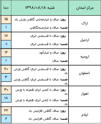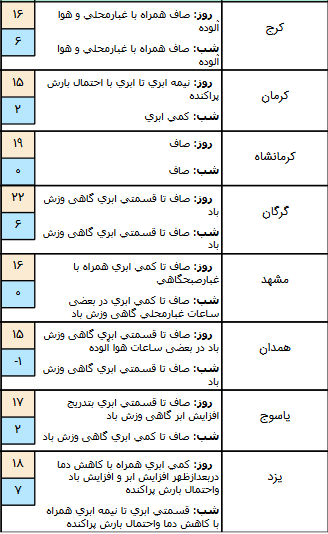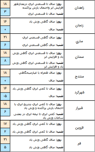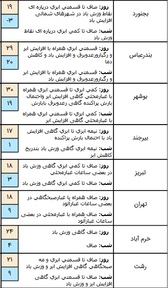 روز شنبه در برخی نقاط استانهای فارس، بوشهر، کرمان، هرمزگان، سیستان و بلوچستان ، غرب یزد، جنوب اصفهان ، جزایر واقع در شرق خلیج فارس و تنگه هرمز رگبار و رعد و برق گاهی وزش باد شدید موقت پیش بینی میشود.