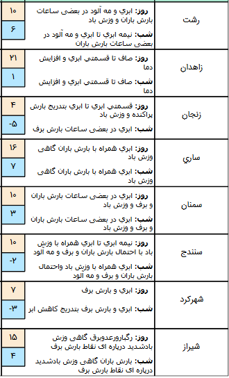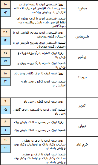 روز چهارشنبه بارش در نوار غربی کشور قطع شده و بارش در نیمه شرقی، سواحل شمالی، استانهای واقع در دامنههای جنوبی البرز مرکزی و مرکز کشور و روز پنج شنبه بارش در نیمه شرقی، سواحل شمالی، اردبیل، شرق آذربایجان شرقی و ارتفاعات البرز مرکزی رخ خواهد داد.