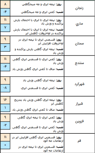 براساس نقشه‌های هواشناسی، امروز در سواحل خزر بارش باران و در شمال شرق کشور و ارتفاعات البرز مرکزی بارش برف پیش بینی می‌شود.