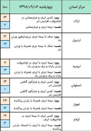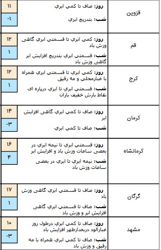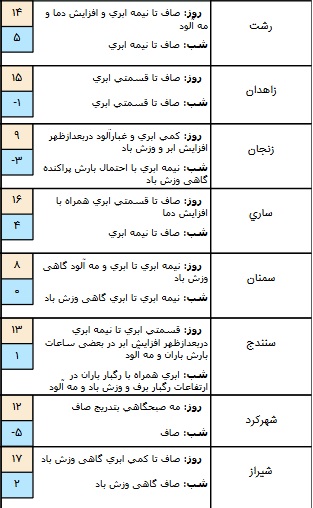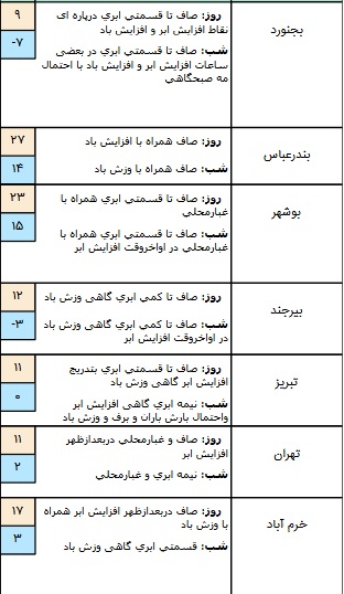پنجشنبه علاوه بر شمال غرب و غرب و همچنین استانهای واقع در دامنههای غربی و مرکزی در استانهای زنجان، قزوین، البرز، تهران بارش باران و برف و وزش باد و در مناطقی از جنوب غرب کشور مثل استان ایلام، استان خوزستان و غرب خلیج فارس، رگبار باران و رعد و برق و وزش باد پیش بینی میشود.