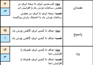 از عصر پنجشنبه به تدریج از آلودگی هوا در تهران، کرج، اراک، قم و اصفهان کاسته میشود و کیفیت هوا بهبود مییابد. جمعه بارش پراکنده در برخی نقاط غرب، جنوب غرب و ارتفاعات زاگرس مرکزی پیش بینی میشود. شنبه و یکشنبه در اغلب نقاط کشور، جوی آرام حاکم خواهد بود.