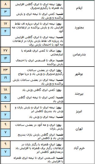 روز چهارشنبه از فعالیت این سامانه در نیمه غربی کشور کاسته شده و در مناطقی از شمال شرق و جنوب شاهد بارش پراکنده و وزش باد خواهیم بود. روز پنج شنبه با نفوذ جریانات سرد شمالی به روی نوار شمالی، ابتدا در شمال غرب، سواحل دریای خزر، دامنههای جنوبی البرز مرکزی و ارتفاعات آن و بتدریج در شمال شرق شاهد بارش باران و در مناطق سردسیر و مرتفع بارش برف به همراه کاهش نسبی دما خواهیم بود.