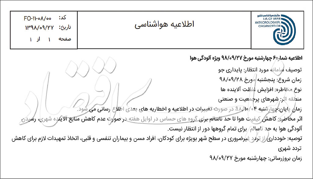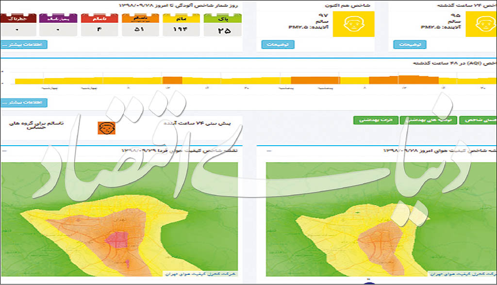 هشدار دوم توسط سازمان هواشناسی با اسم بردن از شهرهای پرجمعیت و صنعتی (که تهران شهر شاخص در این زمینه بهشمار میرود) منتشر شد. چهارشنبه گذشته در اطلاعیه سازمان هواشناسی اعلام شد، کیفیت هوا در شهرهای پرجمعیت و صنعتی به مدت یک هفته یعنی تا چهارشنبه چهارم دیماه در شرایط ناسالم قرار میگیرد و لازم است تدابیر لازم برای خودداری از تردد غیرضروری در سطح شهر به ویژه برای کودکان اتخاذ شود و همچنین برای کاهش رفت و آمد در شهر «تمهیدات لازم» در نظر گرفته شود. هشدار سوم نیز پنجشنبه گذشته توسط نقشههای پیشبینی آلودگی هوا از سوی شرکت کنترل کیفیت هوای تهران منتشر شد که نشان میداد در روزهای جمعه و شنبه محدوده جغرافیایی وضعیت زرد و قرمز در تهران بزرگتر میشود که به معنای تشدید دوباره آلودگی هوا است. ظهر پنجشنبه گذشته شاخص کیفیت هوا حول و حوش ۱۲۰ قرار گرفت و عملا وضعیت نارنجی را نشان داد. با همه این هشدارهای صریح و رسمی و تکلیفی که قانون در عمل به این هشدارهای آلودگی برای دولت تعیین کرده، کمیته اضطرار عصر پنجشنبه تشکیل جلسه میدهد و با عبور از پیشبینیها درباره موج جدید آلودگی هوا، از تعطیلی مدارس بهعنوان «آخرین سلاح مقابله با هوای سمی» خودداری میکند و تصمیمگیری را به ظهر جمعه موکول میکند.