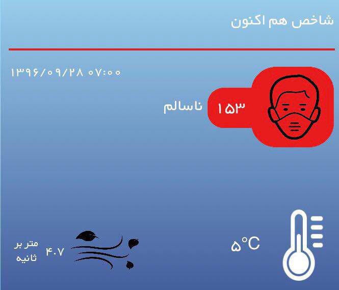 کیفیت هوای تهران با شاخص ۱۵۳ در شرایط ناسالم برای همه افراد جامعه است.