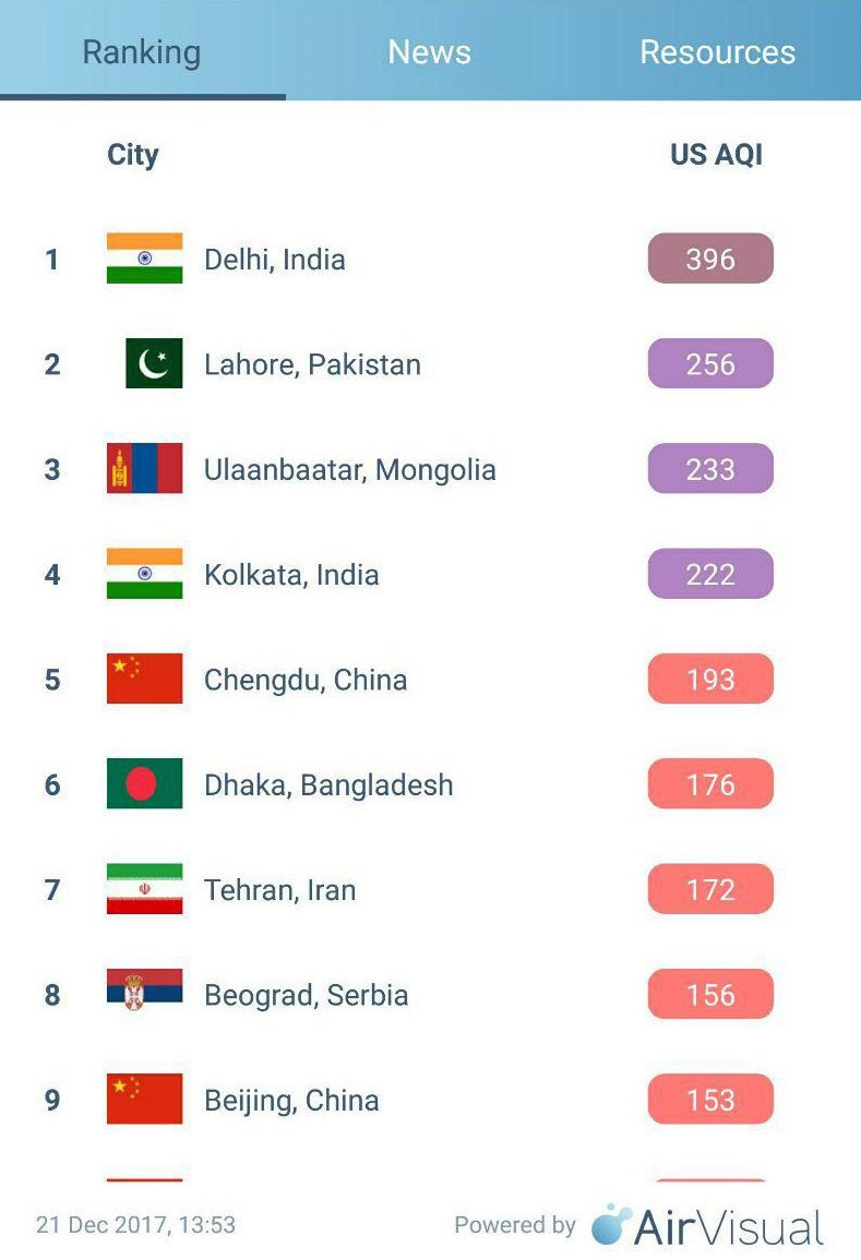 تهران با شاخص آلودگی 172 در بین 10 شهر اول آلوده جهان جا گرفت. دهلی با شاخص 396 اولین شهر آلوده جهان است.