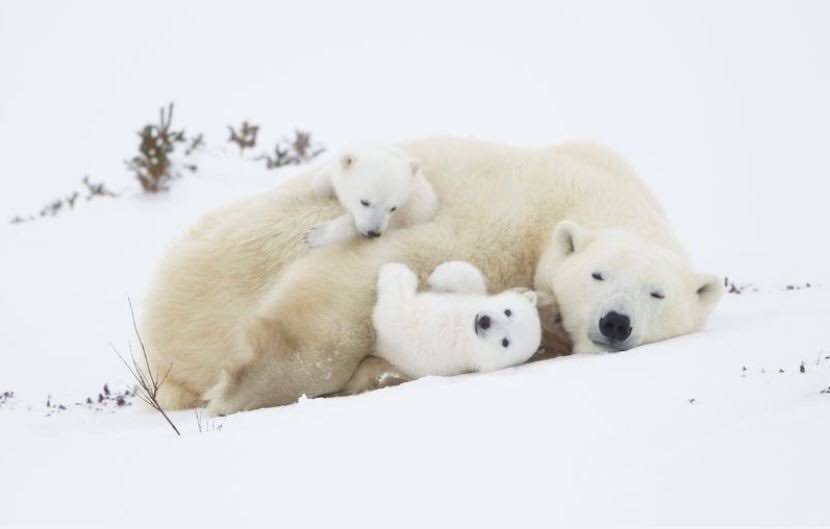 دو توله خرس قطبی پس از بیرون آمدن از لانهشان در قطب شمال از سر و کول مادرشان بالا می روند. در این عکس یکی از توله خرسها به دوربین نگاه میکند، گویی به ما لبخند می زند.