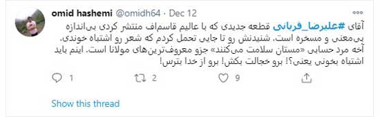 به نحوی که حتی اگر کسی اهل شعر و ترانه هم نباشد، با خواندن متن شعر این تغییر در ریتم را احساس خواهد کرد. شعری که محمدرضا شجریان هم آن را در آلبوم رندان مست خوانده بود. اسماعیل امینی، شاعر، به‌دنبال این اتفاق، پستی در اینستاگرام خود بارگذاری کرد و خطاب به قربانی نوشت: «این اثر مشترک عالیم قاسم‌اف و علیرضا قربانی است. قربانی، شعر مولانا را با دستکاری و خراب کردن وزن می‌خواند. آقای قربانی! شما که هنرمندی صاحب‌نام و توانمند هستید، چرا به شعر و کتاب بی‌اعتنایی می‌کنید؟»