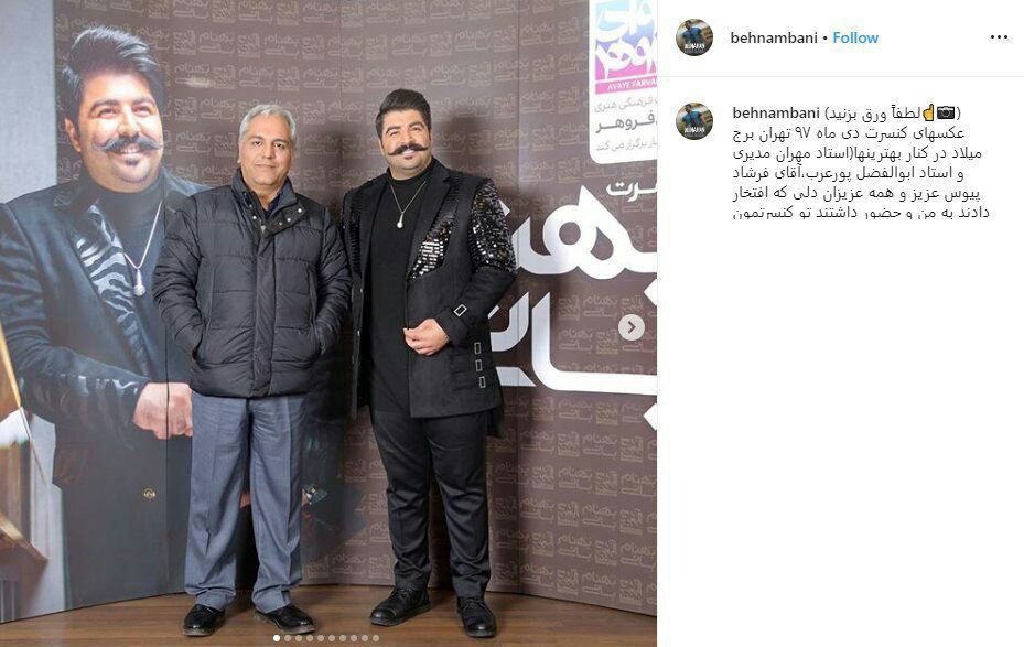 بهنام بانی، تصاویری از خود و هنرمندانی را که مهمان کنسرت ۲۷ دی او در برج میلاد بودند، در اینستاگرام منتشر کرد.