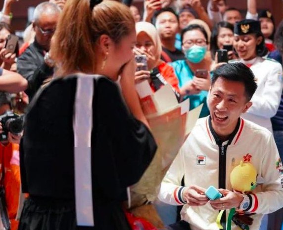 شمشیرباز تیم ملی هنگکنگ پس از کسب مدال برنز،در بین هواداران و تماشاگران حاضر درسالن رقابتهای آسیایی جاکارتا از دختر مورد علاقهاش درخواست ازدواج کرد