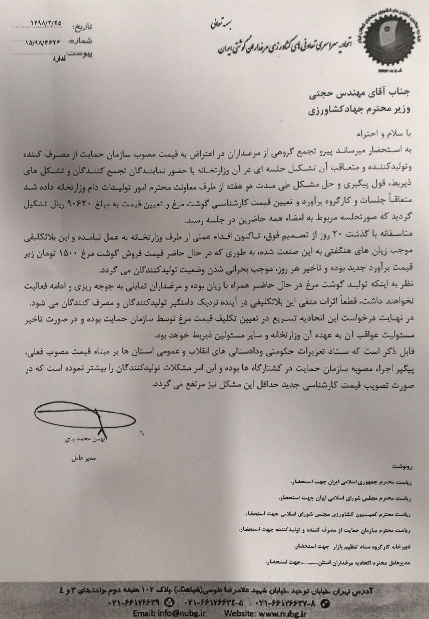 بهمن محمد یاری مدیرعامل اتحادیه سراسری کشاورزی مرغداران گوشتی ایران با ارسال نامه ای به محمود حجتی وزیر جهاد کشاورزی نوشت: پیرو تجمع گروهی از مرغداران در اعتراض به قیمت مصوب سازمان حمایت مصرفکنندگان و تولیدکنندگان و متعاقب آن تشکیل جلسهای در آن وزارتخانه با حضور نمایندگان تجمعکنندگان و تشکلهای ذیربط، قول پیگیری وحل مشکلات طی مدت دو هفته از طرف معاونت محترم امور تولیدات دام وزارتخانه داده شد.