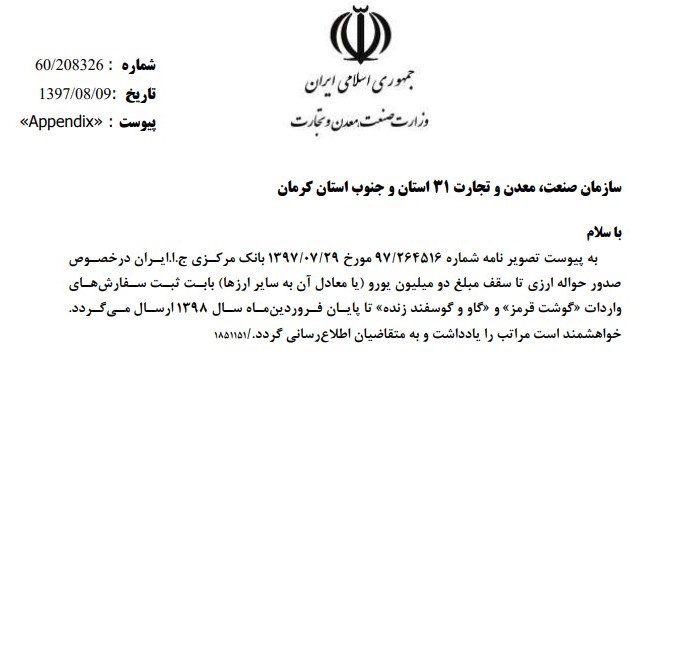 وزارت صنعت، معدن و تجارت با ارسال بخش نامه ای به سازمان های خود در استانهای کشور اعلام کرد: به پیوست تصویر نامه بانک مرکزی، صدور حواله ارزی تا سقف مبلغ دو میلیون یورو یا معادل آن با سایر ارزها بابت ثبت سفارش های واردات گوشت قرمز و گاو و گوسفند زنده تا پایان فروردین سال 98 امکان پذیر است.